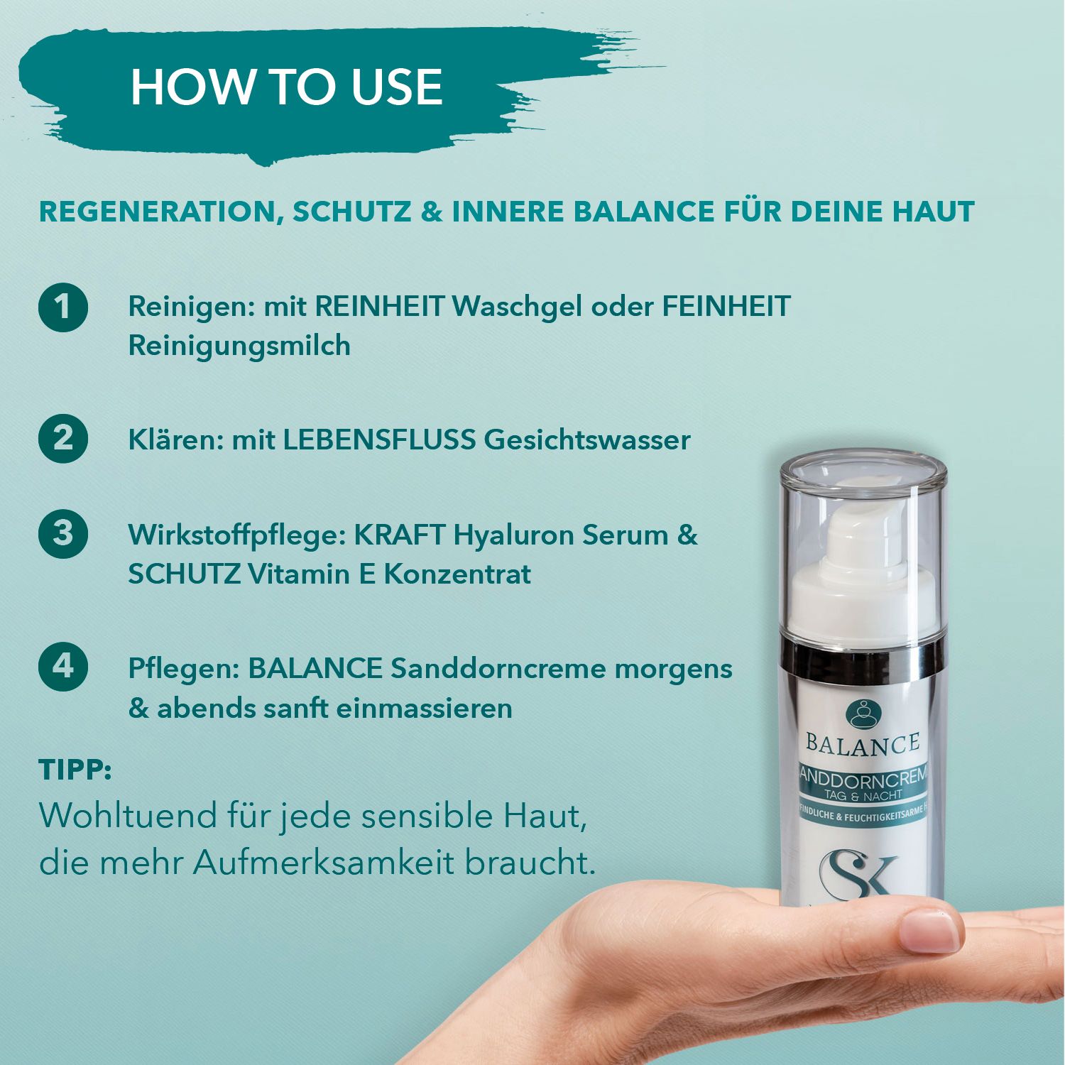Mit jeder Anwendung fühlt sich deine Haut ruhiger, geschmeidiger und widerstandsfähiger an. Sie wirkt glatter, frischer und gut versorgt. BALANCE begleitet deine Haut achtsam durch den Tag und durch die Nacht.