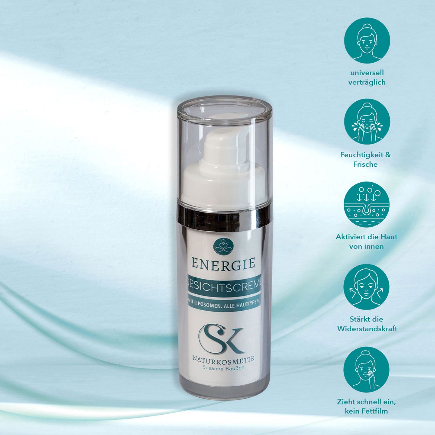 Vier Pumpstöße auf Gesicht, Hals und Dekolleté sprühen, mit einem Wattepad abnehmen und anschließend erneut auf die Haut geben. - Pflege mit ENERGIE Creme