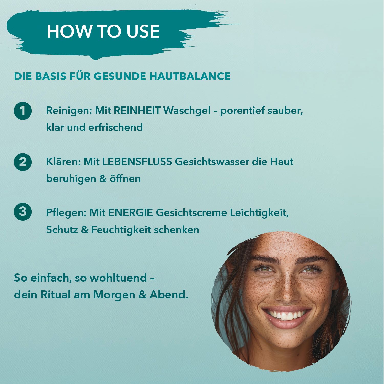 Morgens und abends eine kleine Menge REINHEIT auf die angefeuchtete Haut geben. Mit ruhigen Bewegungen sanft einmassieren, auch am Hals, und mit lauwarmem Wasser abspülen. Bei Bedarf den Schritt wiederholen. - Klären und ausgleichen mit LEBENSFLUSS