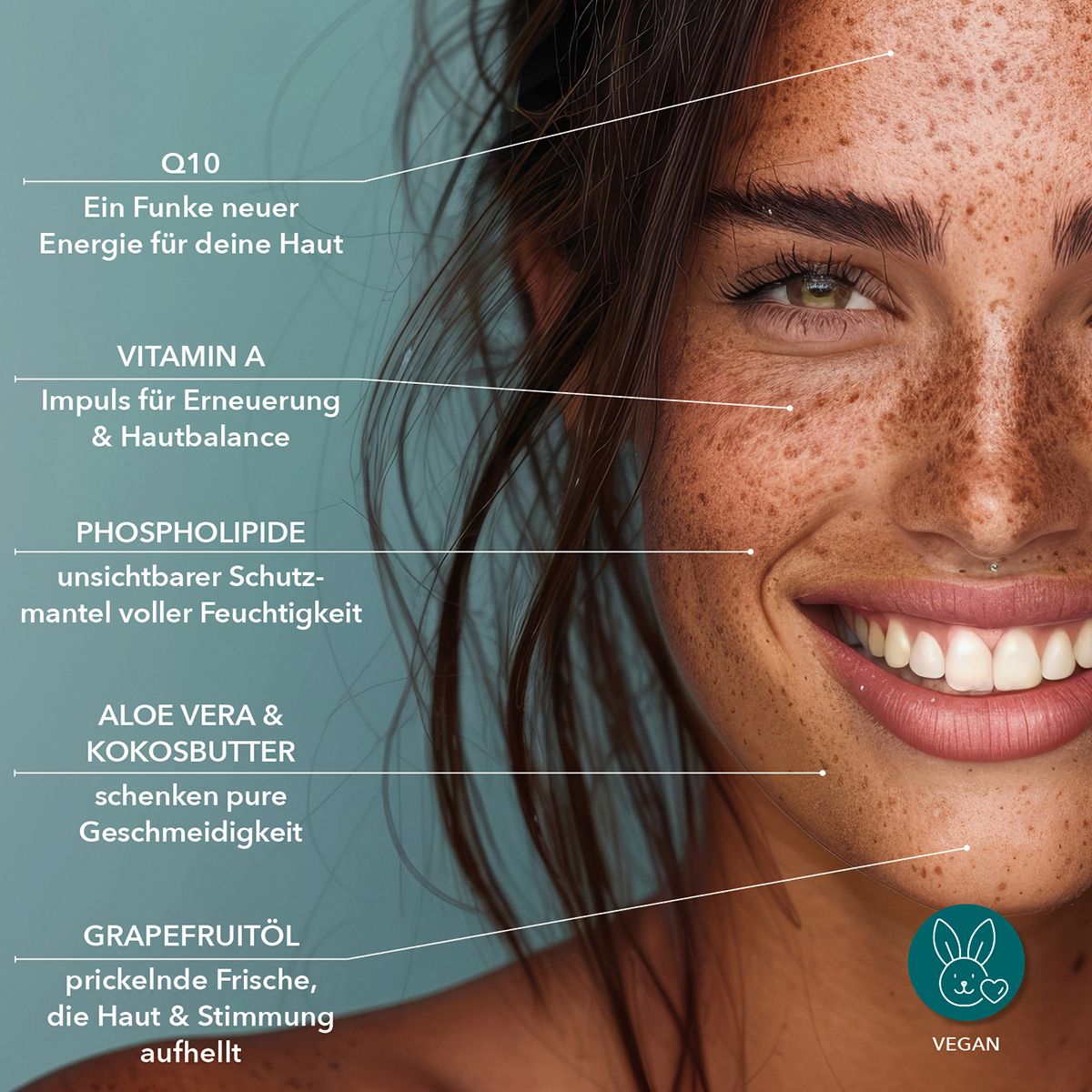 - Q10 unterstützt die natürliche Energie deiner Hautzellen und hilft ihr, sich vor vorzeitiger Hautalterung zu schützen.