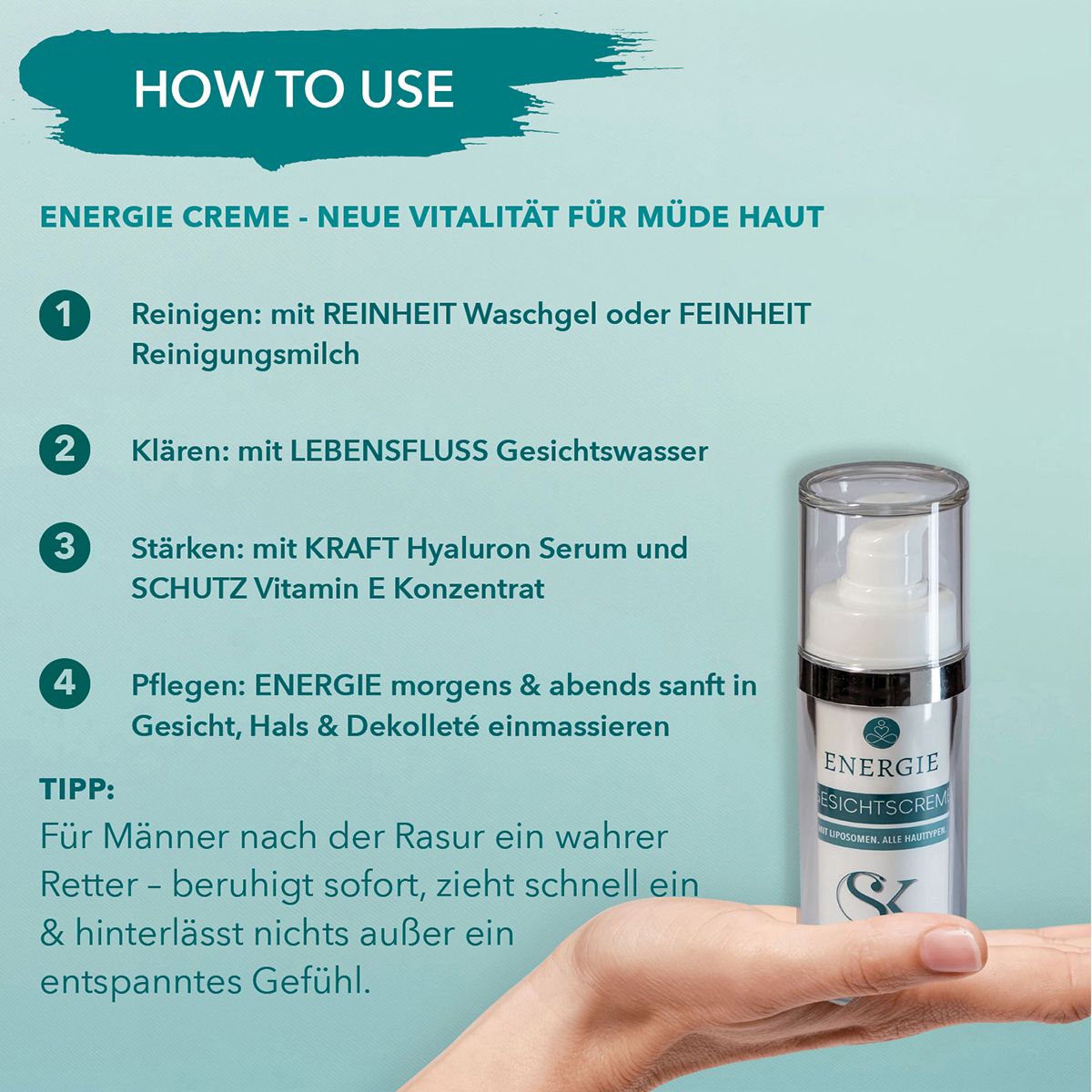 - ENERGIE Creme auftragen: Massiere ENERGIE morgens und abends sanft in Gesicht, Hals und Dekolleté ein. Die leichte Textur zieht schnell ein.