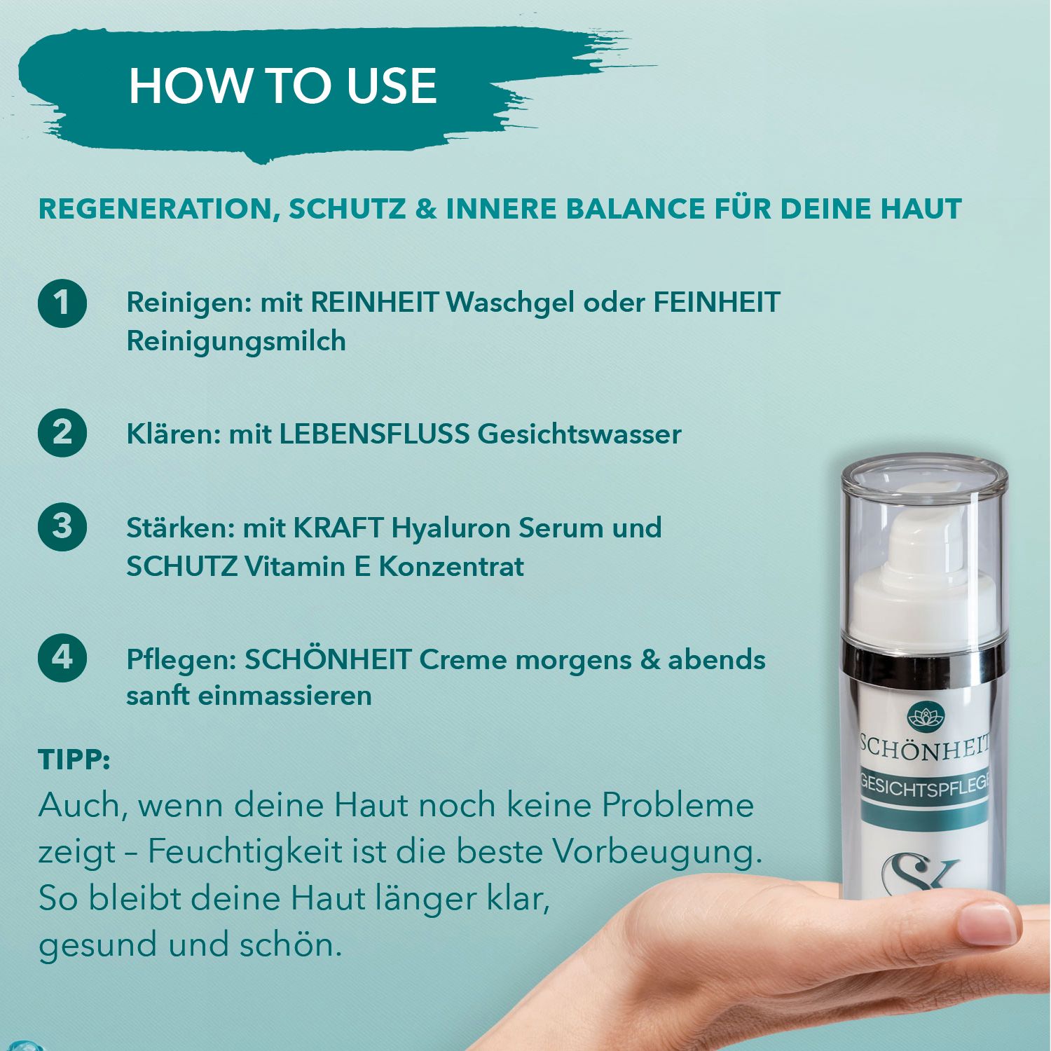 Tipp: Auch, wenn deine Haut noch keine Probleme zeigt. Feuchtigkeit ist die beste Vorbeugung. So bleibt deine Haut länger klar, gesund und schön.